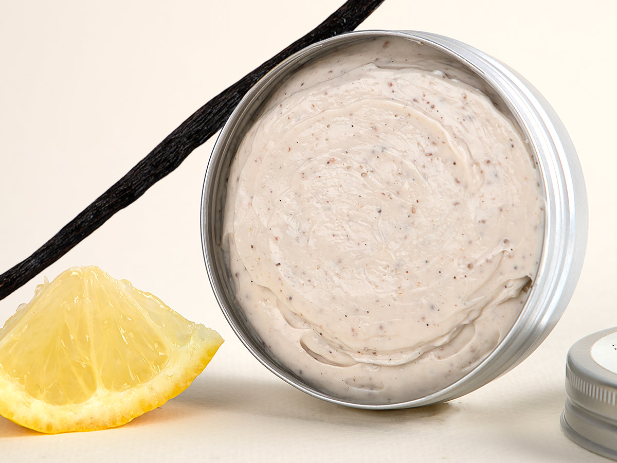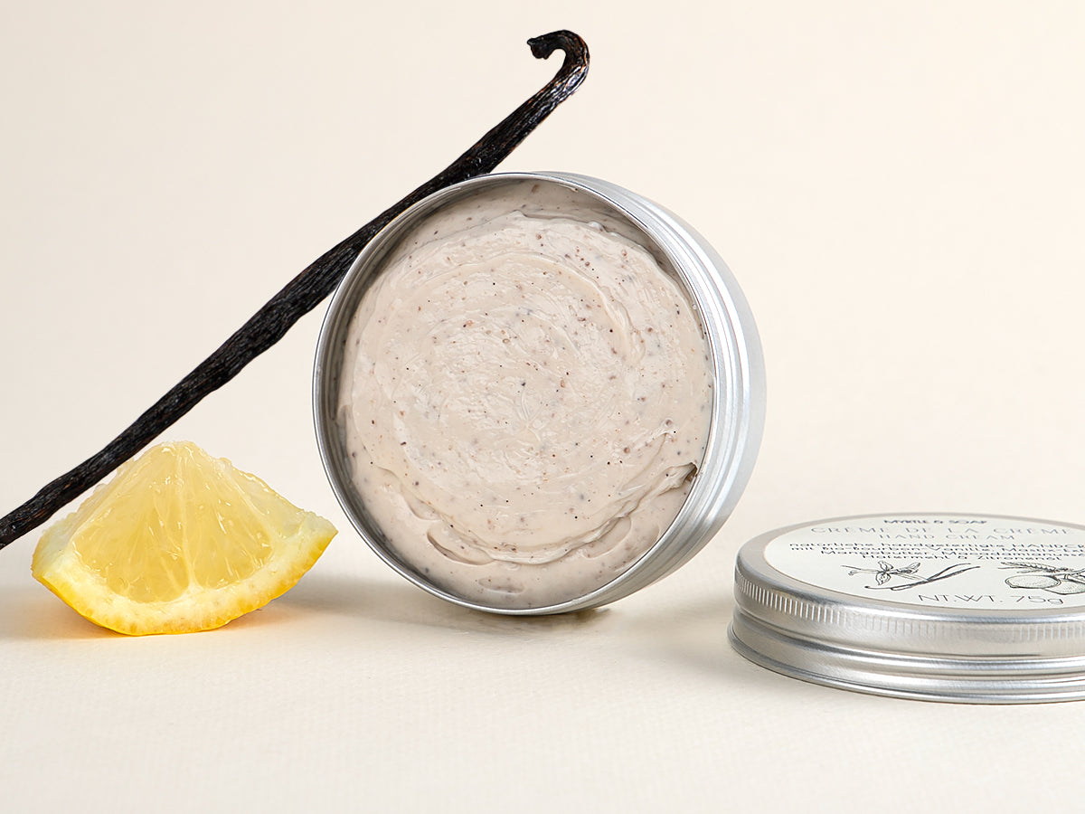 ...ihre botanischen Namen Aqua, Mangifera Indica Seed Butter, Macadamia Integrifolia Seed Oil, Glycerin (Plant-based), Cetearyl Olivate*, Sorbitan Olivate*, Citrus Limon Peel Oil, Limonene****, Avena Sativa Kernel Flour, Brassica alcohol, Tocopherol, Pistachia Lentiscus Gum, Vanilla Planifolia Seed Powder**, Helianthus Annuus Seed Oil, Acacia Senegal Gum, Xanthan Gum, Rosmarinus Officinalis Leaf Extract**, Benzyl alcohol***, Dehydroacetic acid***, Linalool****, Citral****, Geraniol****, Citronellol****