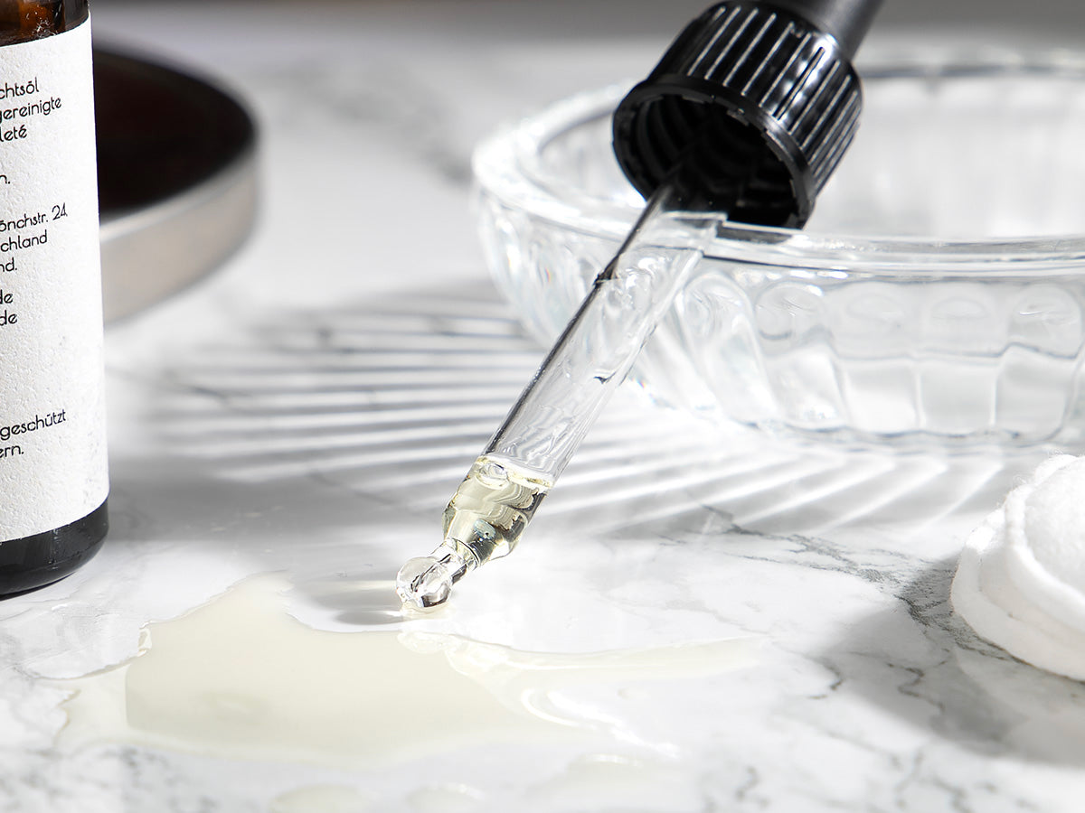 Das Gesichtsöl gleichmäßig auf das gereinigte Gesicht und das Dekolleté auftragen. Mund und Augenpartie auslassen.