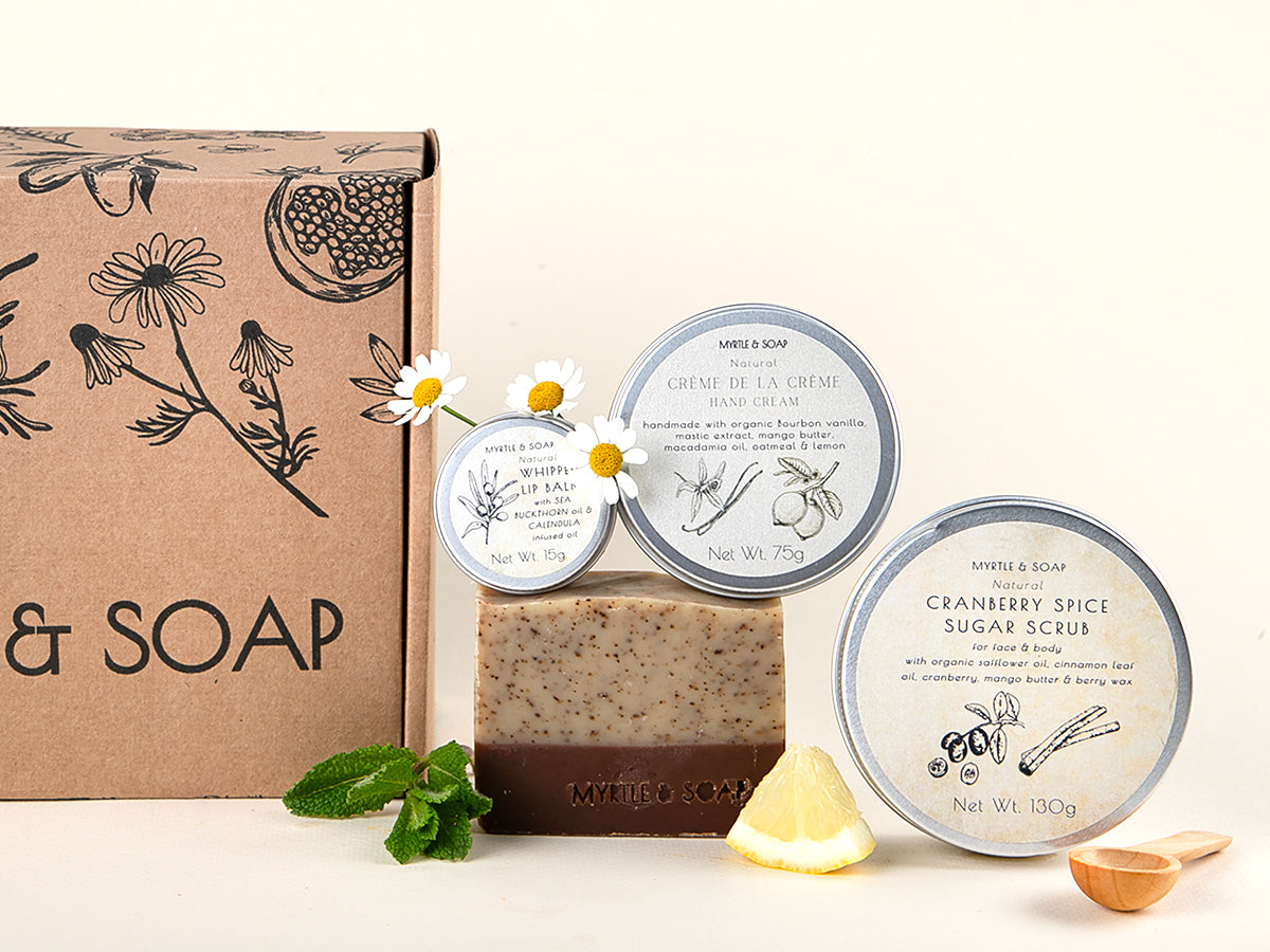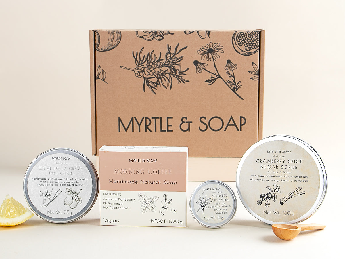 Unsere Hautpflegeprodukte werden in wiederverwertbaren Aluminiumbehältern und die Seifen in umweltfreundlichen Seifenbeuteln aus Papier verpackt. Alle Produkte werden in einer Myrtle & Soap-Box aus ökologischem Karton geliefert, die mit natürlicher Holzwolle gefüllt und mit Rosenblättern bestreut ist.