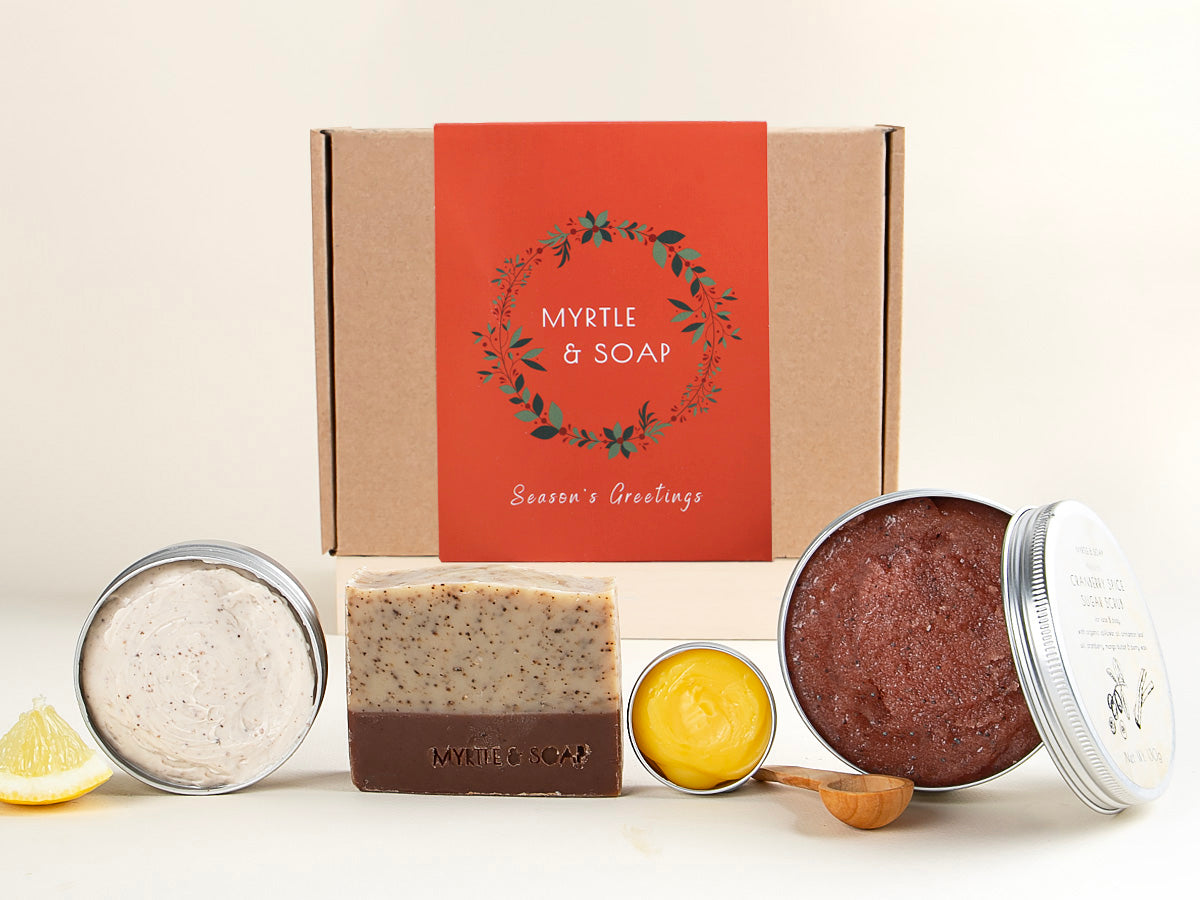 Genieße den beruhigenden Duft von Zimt und Cranberries, während du mit unserem Cranberry Spice Sugar Scrub peelingst und deine Haut weich und erfrischt wird. Erlebe eine revitalisierende Reinigung mit unserer Überraschungs-Naturseife*, und verwöhne dich anschließend mit unserem pflegenden Whipped Lip Balm, angereichert mit Ringelblumenöl. Zum Schluss, genieße den gemütlichen Duft unserer Crème de la Crème Handcreme, hergestellt mit echten organischen Bourbon-Vanilleschoten, griechischem Mastix und Zitrone, für einen Hauch von sonnigen Obstgärten und exotischem Glück.