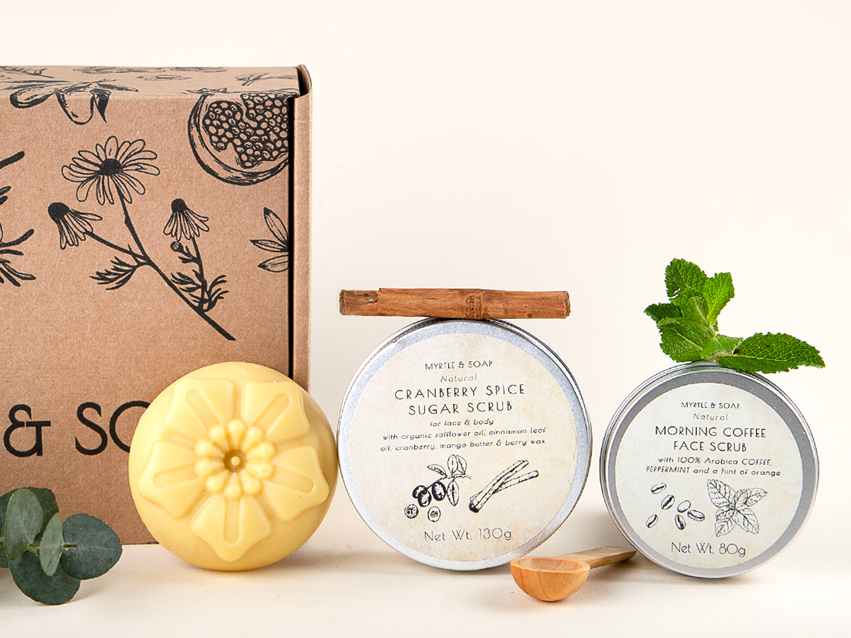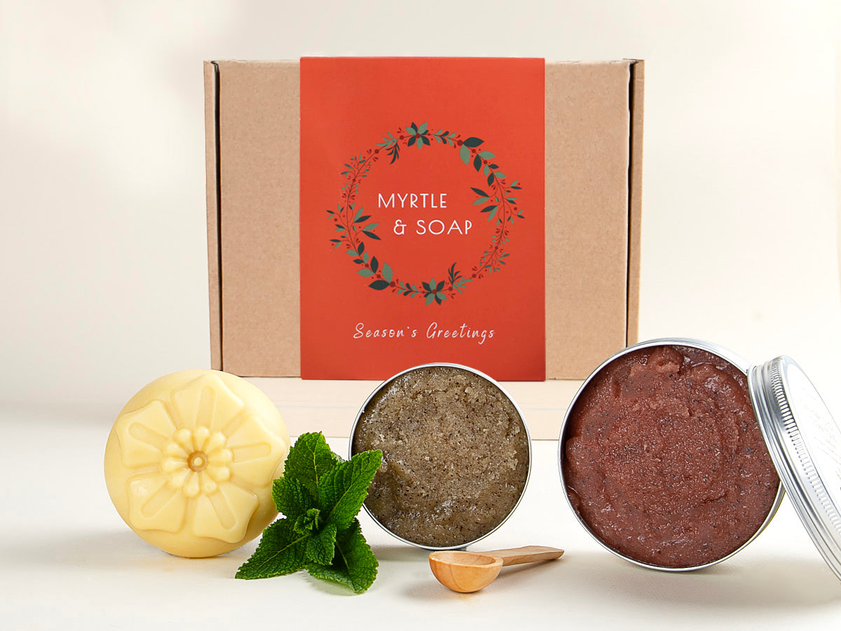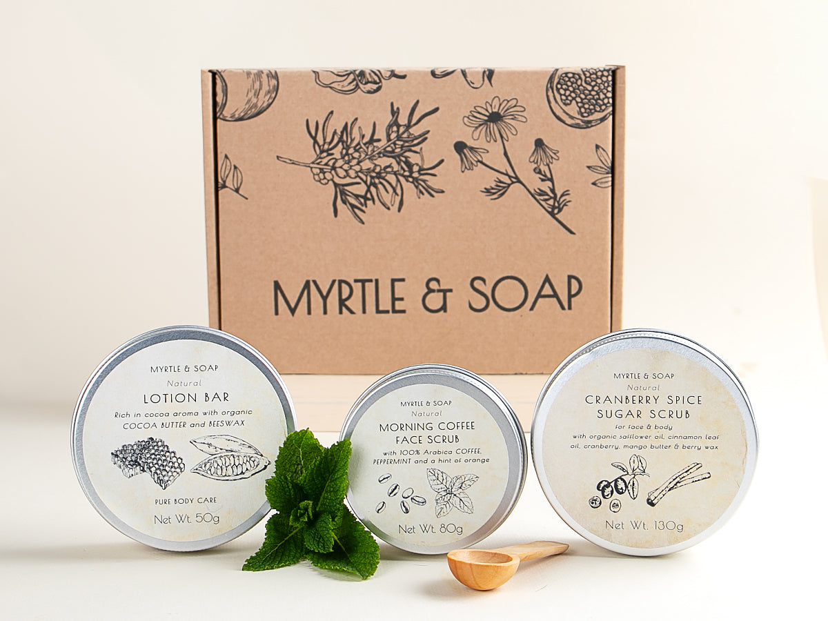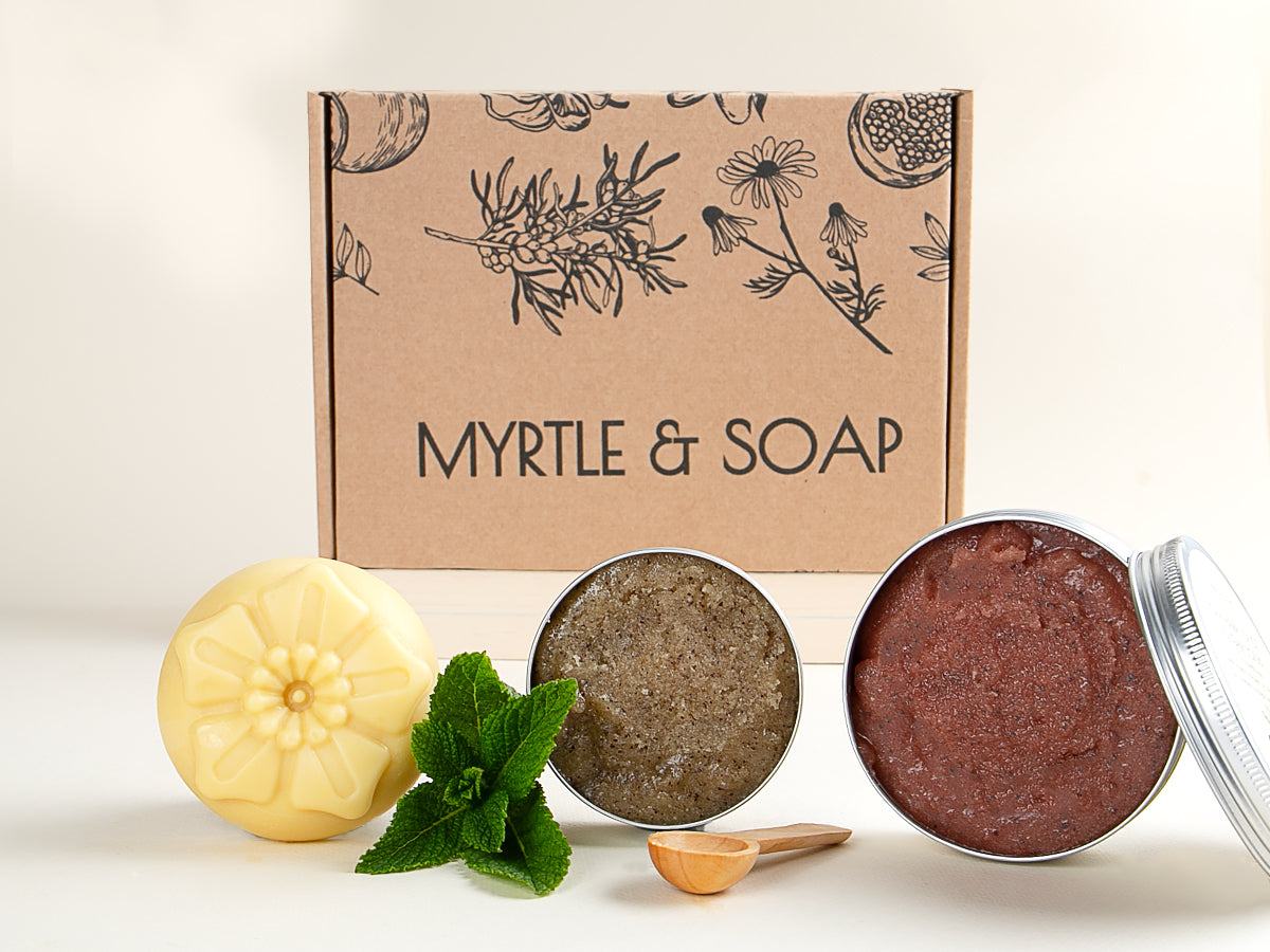 Unsere Peelings und Lotion Bar sind in recycelbaren Behältern aus Aluminium verpackt und werden in einer Myrtle & Soap-Schachtel aus ökologisch neutral hergestelltem Karton geliefert, die mit natürlicher Holzwolle gefüllt und mit Rosenblättern bestreut ist.