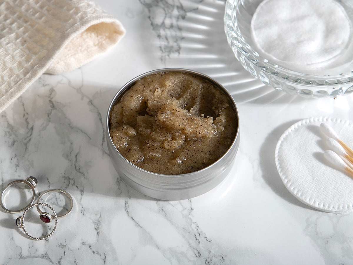 - einem natürlichen "Morning Coffee" Gesichtspeeling mit Zucker, 100% Arabica-Kaffeesatz, erfrischender Pfefferminze und einem Hauch Orange (Nettogewicht 80g)