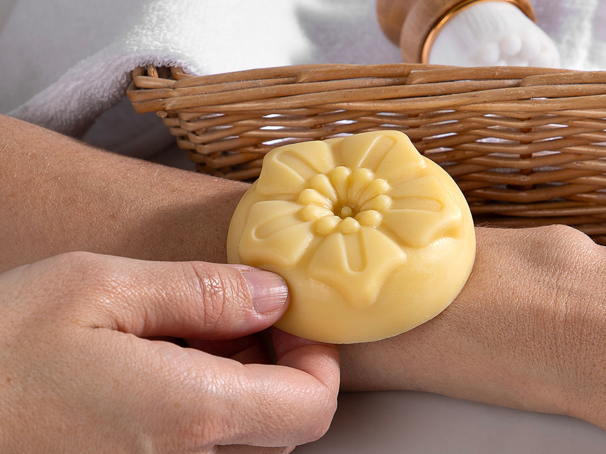 - einer natürlichen Lotion Bar mit Bio-Kakaobutter und reich an Kakaoaroma (Nettogewicht 50g)