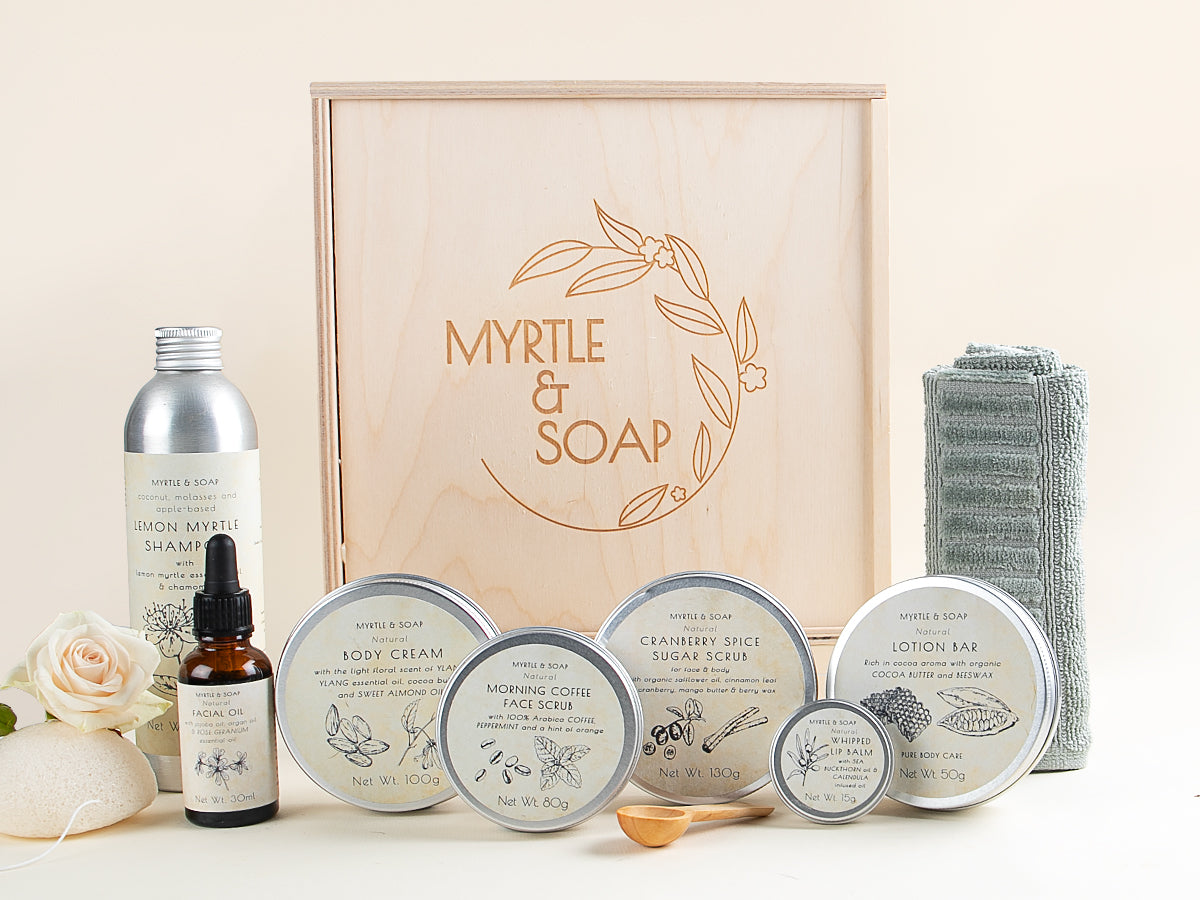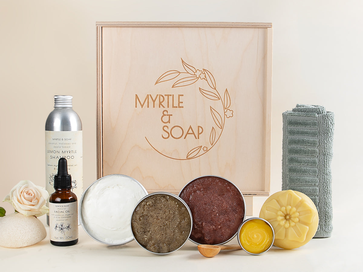 Unser Myrtle MyBox Premium Care Set enthält die folgenden handgefertigten Haut- und Haarpflegeprodukte, verpackt in einer Holzkiste: