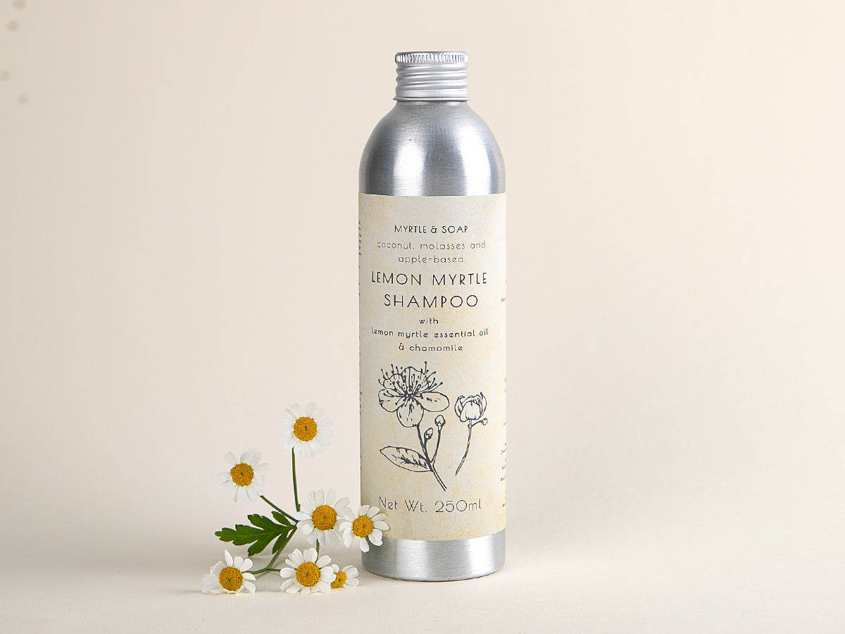 - ein Lemon Myrtle Shampoo auf pflanzlicher Basis mit Kamillenblütenpulver und Zitronenmyrtenöl (Nettogewicht 250 ml)