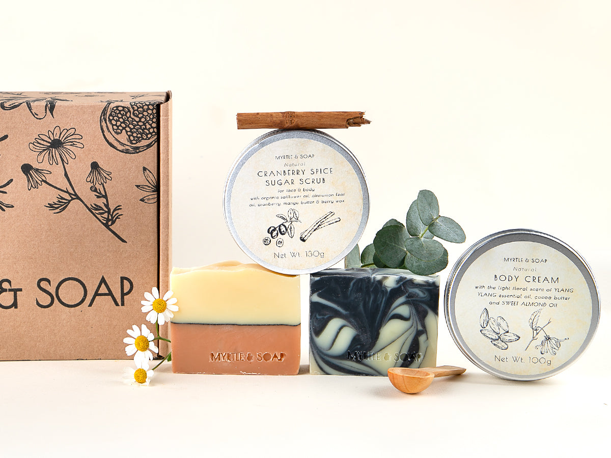 Dieses Myrtle & Soap Set enthält zwei der folgenden sechs natürlichen Seifen, die wir in unserer Sammlung haben: